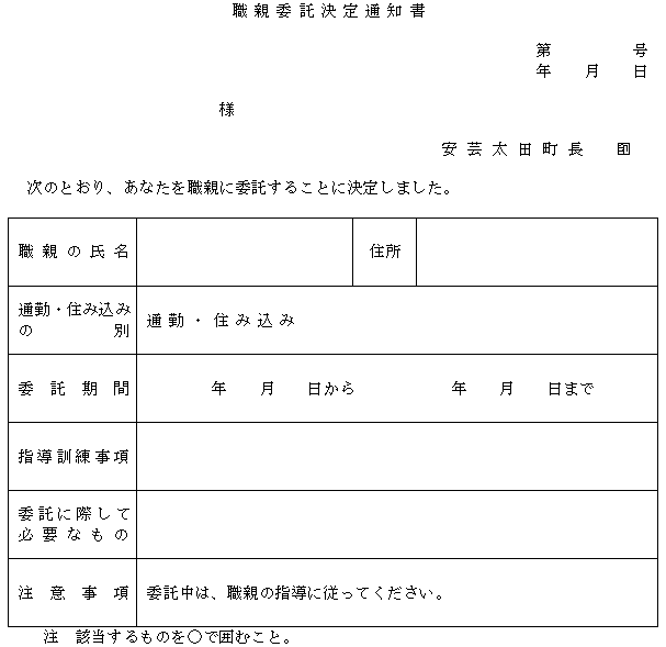 第5条 町長は、法第16条第1項第3号の規定により、知的障害者の更生援護を職親に委託することを決定したときは、職親委託決定通知書(