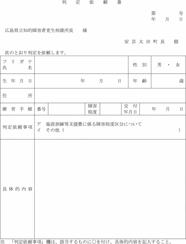 第2条 町長は、法第9条第6項又は法第16条第2項の規定により知的障害者更生相談所(法第9条第5項に規定する知的障害者更生相談所をいう。以下「更生相談所」という。)に判定を求めるときは、判定依頼書(
